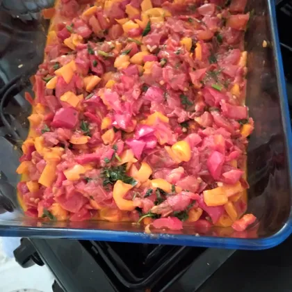 Добавила помидоры в емкость к перцам, перемешала, проверила на вкус. Добавления специй и соли не понадобилось.