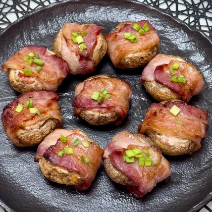 Начиняем творожной начинкой шляпки шампиньонов, обворачиваем беконом и смазываем соусом терияки;