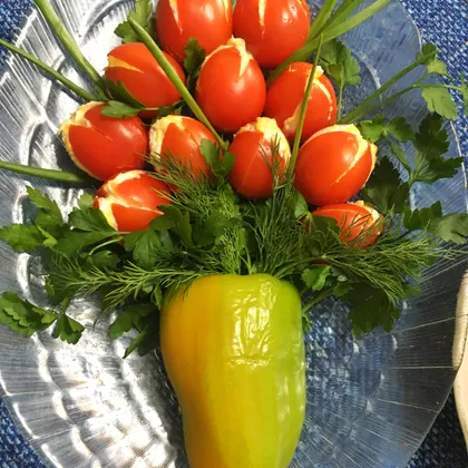 Украшаем зеленью в форме букета тюльпанов. Половина перца - ваза)