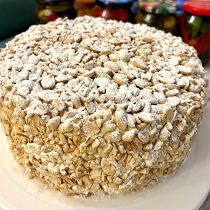 Арахис обжарить на сухой сковороде, постоянно помешивая. Дать полностью остыть, растолочь в ступке не мелко, так чтобы кусочки были разные. Обсыпать торт орехами слегка прижимая. Обсыпать сахарной пудрой. Дать настояться часа 3-4 и подавать.