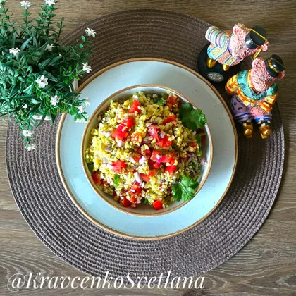 В блюдо выкладываем булгур и мелко нарезанный лук.