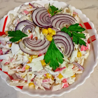 Салат с кальмарами, крабовыми палочками, маринованным красным луком