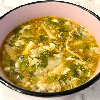 Когда лапша всплывет, влить в суп, тонкой струйкой, взбитое яйцо. И можно подавать.